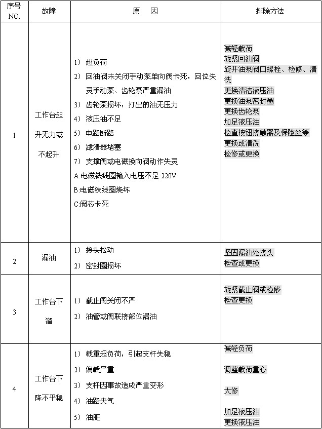 4、平臺(tái)空運(yùn)行1-3次后方可載荷作業(yè)。